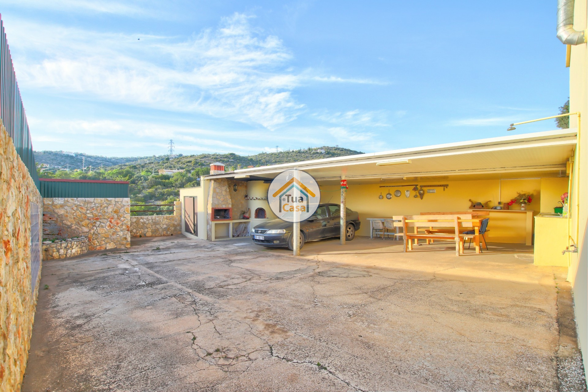 L'extérieur a un grand espace avec porche, un petit garage, un wc, barbecue, étang à poissons et four à bois et même un espace pour mettre la piscine d'été.